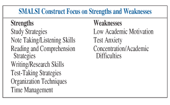 Poor study skills, ineffective learning strategies, test anxiety–all these things impede academic success. With the new SMALSI you can now measure the skills related to academic success early in a student’s school career, enabling you to proactively address weaknesses. Unlike many other learning measures, the SMALSI does not assess learning styles, preferences, or other process dimensions. Instead, it assesses the actual strategies students use in learning and test-taking–strategies shown through research to be related to academic success. Designed for both special and general education students, this self-report inventory assesses 10 primary constructs associated with academic motivation, learning strategies, and studies–7 focusing on student strengths and 3 focusing on student liabilities. .  Scores from the SMALSI scales provide enough information to identify problems that interfere with academic development. An Inconsistent Responding Index is included as a validity measure. The SMALSI is available in two forms: the Child Form (147 items) is appropriate for students ages 8-12 years; the Teen Form (170 items) is appropriate for students ages 13-18 years. Both forms are written at a 3rd-grade reading level and can be completed in about 20-30 minutes. Both forms use a 4-point response scale, ranging from “Never” to “Almost Always.” Scored by hand or computer, the SMALSI provides multiple scores, rather than one overall score. The SMALSI was standardized on a sample of 2,921 students (1,821 aged 8-12 years for the Child Form, and 1,100 aged 13-18 years for the Teen Form). The sample reflects the U.S. population in terms of gender, ethnicity, and parental education. The SMALSI is a quick, cost-effective way to identify students who may have ineffective or poorly developed learning strategies, low levels of academic motivation, attention and concentration problems, difficulties with test-taking, or test anxiety. It can be used for screening in regular education, pre-referral intervention, and for assessing students with learning disabilities, emotional disturbance, or ADHD. |